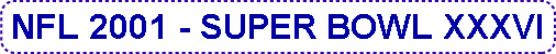 NEW ENGLAND PATRIOTS - ST. LOUIS RAMS 20:17 Aufgrund der Ereignisse vom 11. September 2001 fand der SUPERBOWL XXXVI eine Woche später als ursprünglich geplant statt. Auch das Logo des Endspiel steht ganz im Zeichen von “United We Stand”, dem Motto, das sich die NFL nach den Anschlägen von New York und Washington gegeben hat.